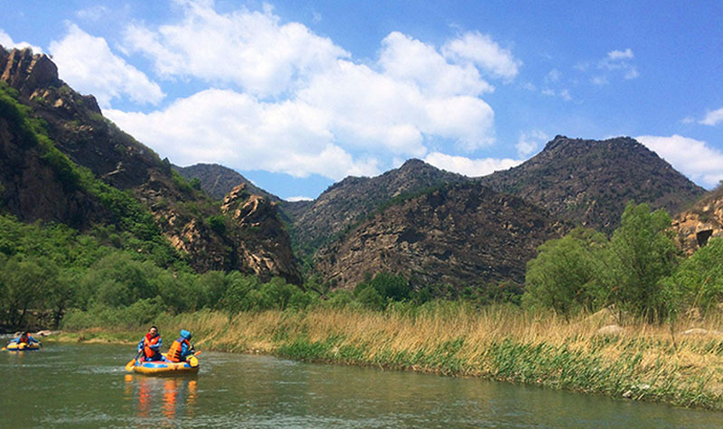 忽而岸柳轻扬,河草萋萋,河鱼草虾深游浅出,悠然自得。漂流沿途古迹很多,有中国女将穆桂英的上马石遗址、古栈道遗址、石人、万缸、响马洞蚂蚁窝、五虎山、花石等景观。漂流时可竞技,可娱乐,可拨筏快驶,可任自漂流,可一人独乐,可全家共享,如情侣伴游更具诗情画意。