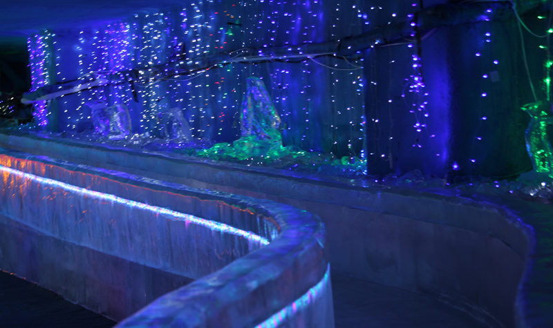 冰滑梯全长110米,用冰量200立方米,游客可以选择“冰上飞碟”和“冰上木马”两种方式体验。冰上芭蕾舞台每周六、周日将分别在上午和下午各举办一场专业的冰上芭蕾表演。冰上群众娱乐区免费为小朋友提供冰尕和冰壶球。
