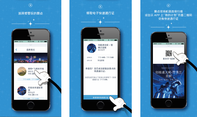 步骤5? 您可在指定时间前往所选择的景点使用迪士尼快速通行证。在景点的迪士尼快速通行证入口扫描您的门票或APP上“我的计划”页面的二维码,验证成功后即可快速进入景点。