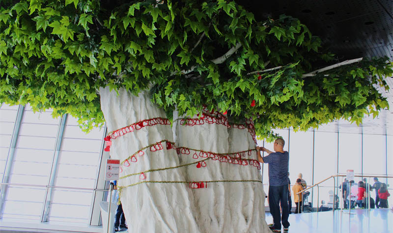 在上海之巅观光厅,有一棵充满生机和希望的绿色“许愿树”,它迎接东方一缕阳光,见证璀璨繁华它依托三柱合力之势,托举出一片申城之巅的绿阴,也寓意开创绿色、智慧、人文的未来生活,三人为众、三木为森,期待更多的人们在上海之巅许下高高美美的心愿,合力滋养更加绿色美好生活!在此写下一张许愿卡,用红绳系在巅峰许愿树上,将会成为期许未来的记忆时刻。