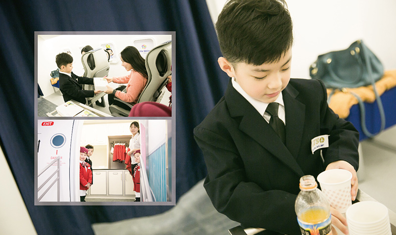 培训完毕后,家长们就可以凭登机牌登机啦!小朋友们会排排站好,在机舱门口迎接爸爸妈妈,一鞠躬一问好都显得很专业呢!