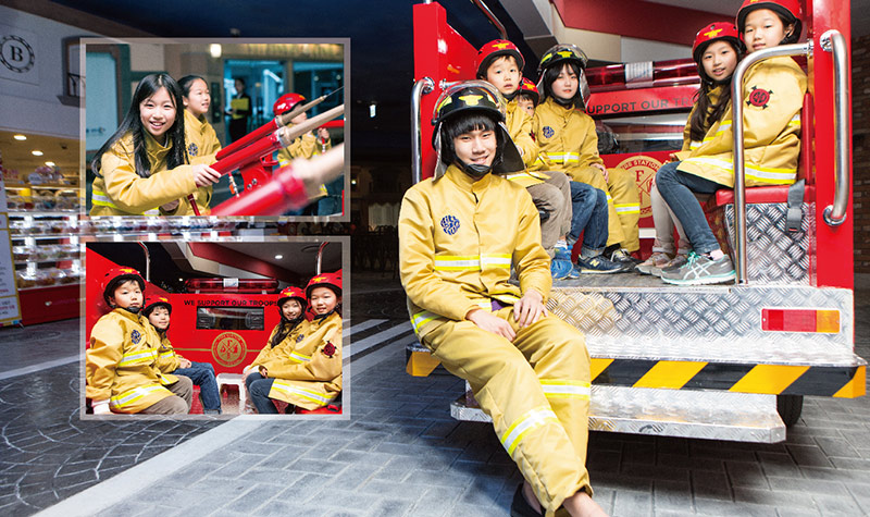 在消防局内的体验流程跟真实的消防局十分接近。小乐宝们会学习到基础的消防知识,并在接到火警通知后整队出发,滑降车库,消防车会拉起警报绕场一周去到火灾现场,到了火灾现场后,小乐宝们每人负责一个喷水枪,扑灭对面“大楼”里的火灾